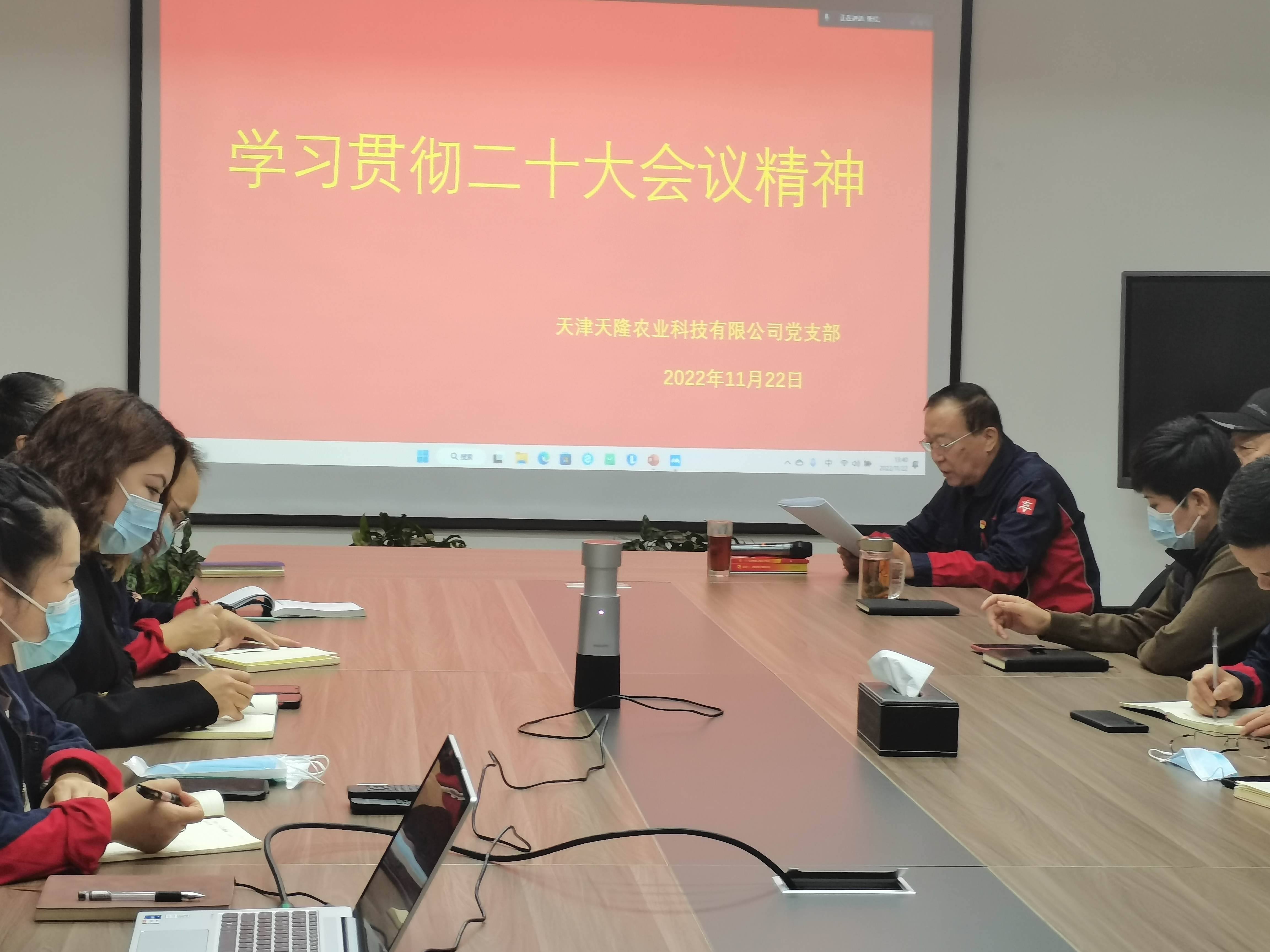 最后包万军先生指出,党的二十大会议定下的大政方针给企业未来一个阶段指明了发展方向,特别是报告中指出“加快建设农业强国”,这是党中央着眼全面建设社会主义现代化国家大局作出的重大决策部署,作为农业战线中的一员,天隆农业科技有限公司将充分结合公司农业发展实际,持续推进农作物新品种选育、植物提取物饲料添加剂研究、农用酶制剂土壤修复改良研究技术和绿色种植研究,以“发展科技创新、打造生态农业,引导产业升级,助力国民健康”为使命。公司今后将一如既往地支持公司党支部各项工作,也希望公司党支部继续发挥战斗堡垒的作用,带领全体员工用咬定目标不放松的坚韧干劲、系统谋划、奋发进取,为全面建设现代化农业强国贡献一份力量。