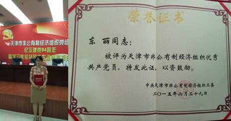 2015年6月29日,在“天津市非公有制党组织纪念建党94周年表彰暨学习焦裕禄同志先进事迹报告会”上,押球官网科研部部长东丽同志作为滨海新区非公有制经济组织优秀党员代表,荣获“天津市非公有制经济组织优秀共产党员”称号。