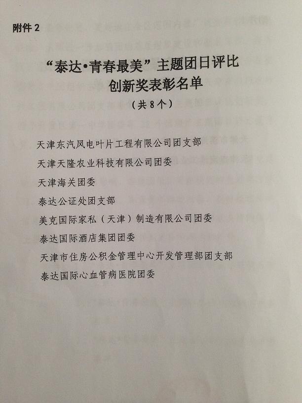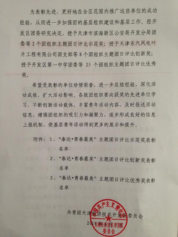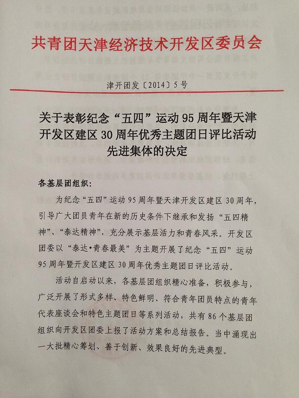 在天津开发区组织的“泰达●青春最美”主题团日评比活动中,押球官网团委组织的“五四”青年节押球官网活动参评,并荣获创新奖。