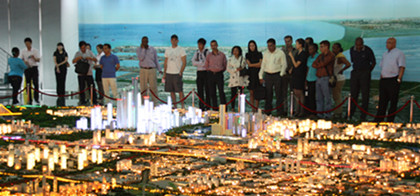 在滨海新区规划馆,客人饶有兴致的观赏了新区规划模型,详细了解了滨海新区的规划和建设情况。