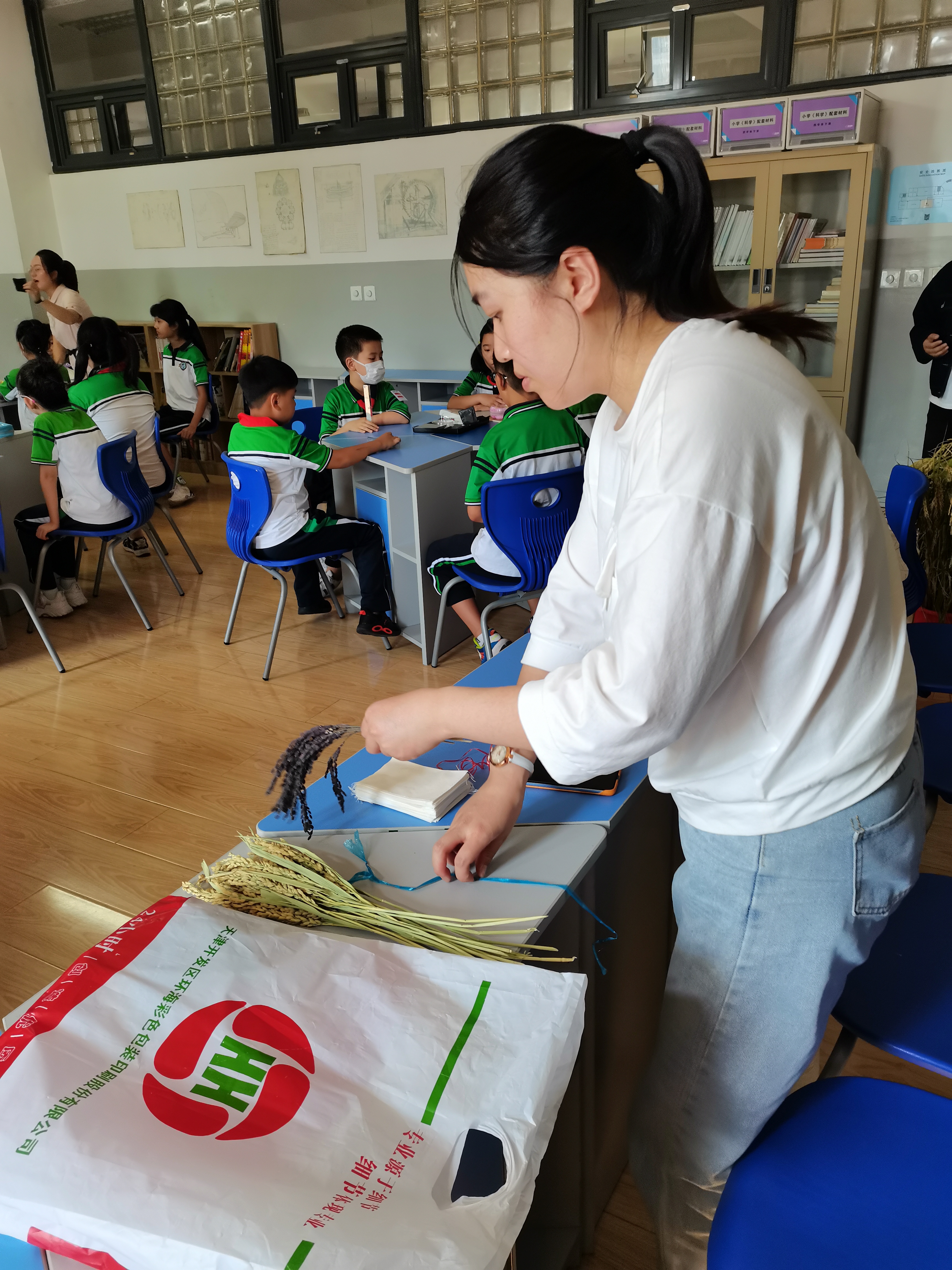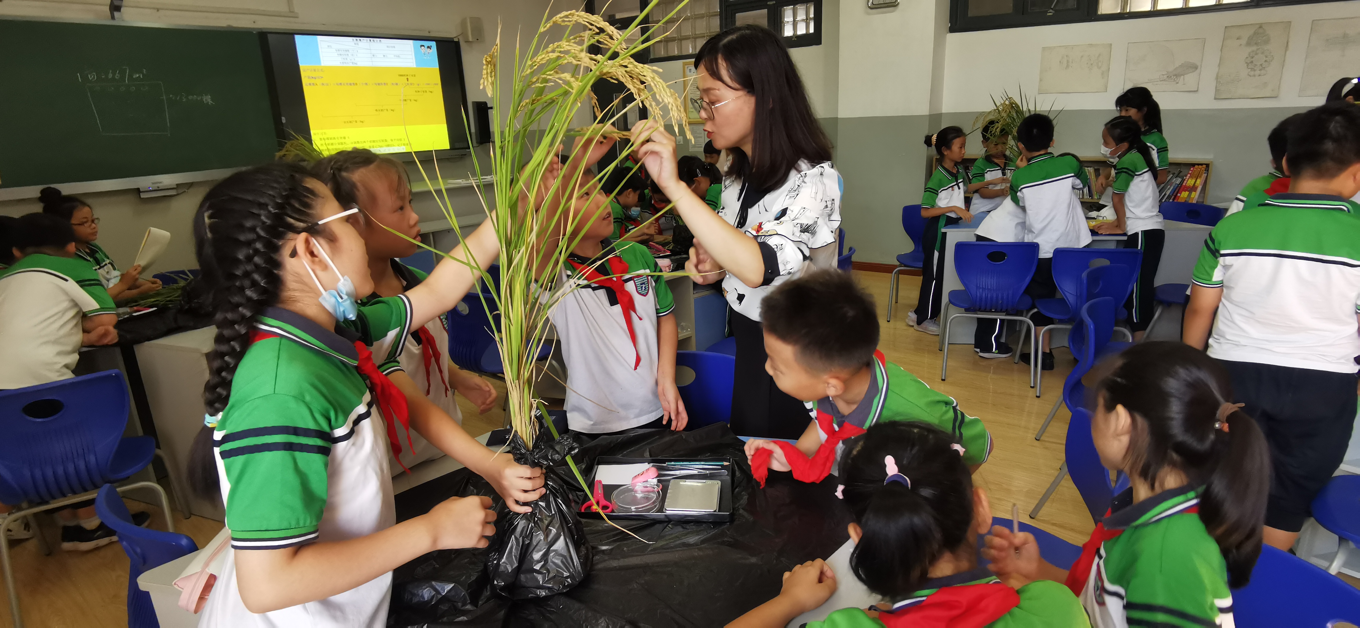 本次校园科普的主题为“袁隆平禾下乘凉梦”,主讲人通过对稻田画、五彩水稻、稻草艺术品和袁隆平超级稻六期攻关的精彩讲解,引入袁隆平院士的两个伟大梦想,让学生们了解袁隆平和杂交水稻以及水稻秸秆资源再利用等知识,培养学生崇尚科学的精神,增强民族自豪感。科普团队为学生带去新鲜的杂交水稻稻株和彩色稻穗,教授学生进行“水稻测产小实验”。同学们通过数分蘖,亲手为稻穗脱粒、数籽粒数,以及称量水稻千粒重等过程,学会了如何估算水稻的亩产。课堂结束后,同学们都纷纷表示要努力学习农业科学知识,完成袁隆平的两个伟大梦想:禾下乘凉梦和杂交水稻覆盖世界梦。