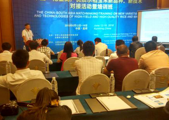 2016年6月14日下午,国家粳稻工程技术研究中心主任、押球官网技术总监华泽田研究员在中国-南亚高产优质水稻玉米新品种对接活动暨培训班上给国内外参会人员培训了杂交水稻的技术并介绍了中国的杂交水稻情况。